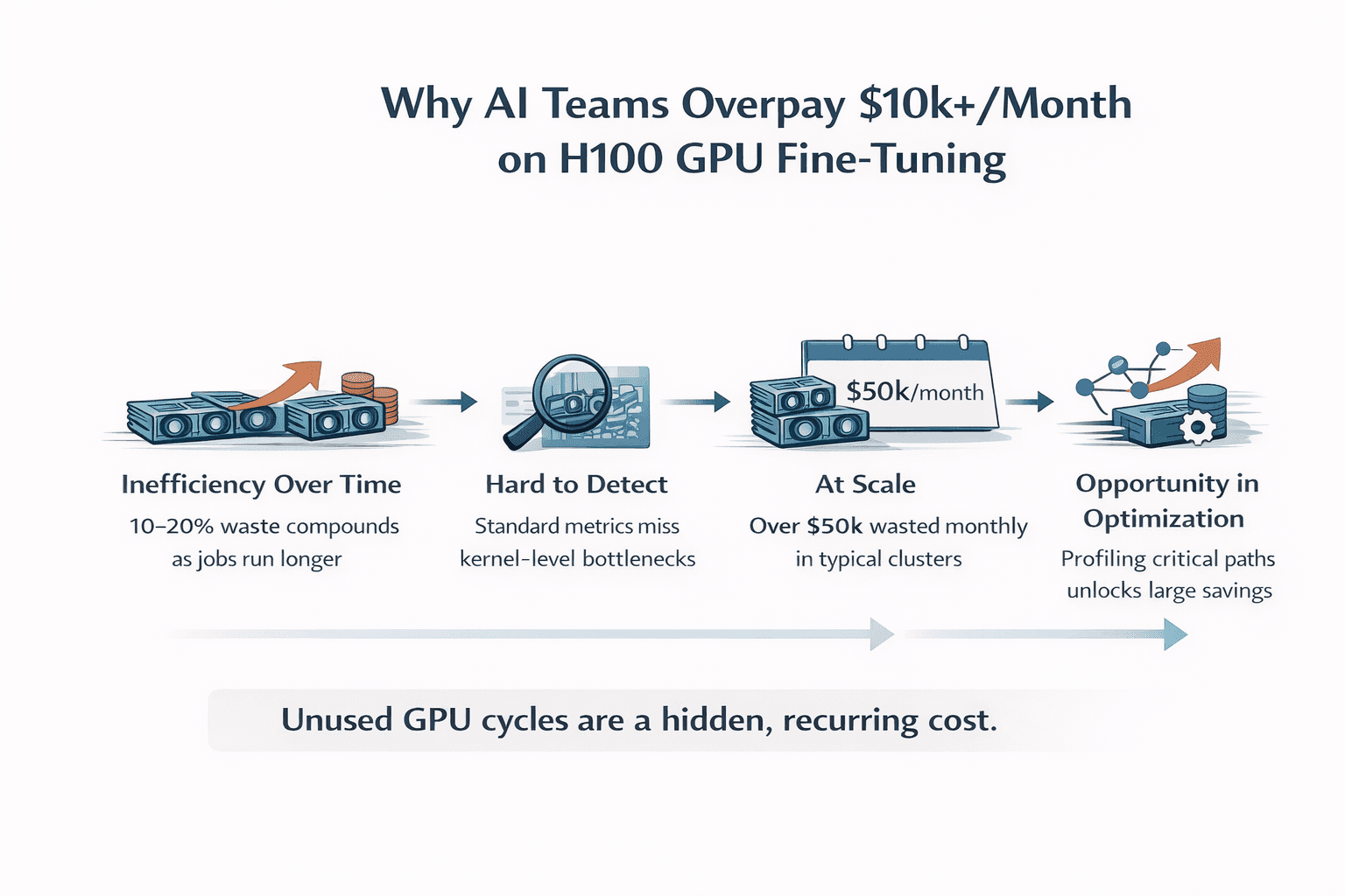 Since GPU cost is directly tied to time-to-completion, any unused performance is effectively paid for but never realized. The dangerous part is that this compounds over time. At a small scale, this inefficiency is easy to dismiss. A slightly longer run here, a bit more GPU time there; it doesn’t raise concern. But at production scale, this becomes a recurring cost. Every training job runs longer than necessary, every experiment consumes more GPU hours than required, and every month unnecessary spend accumulates. What appears to be a minor inefficiency gradually becomes a continuous, hidden tax dollars on your infrastructure.